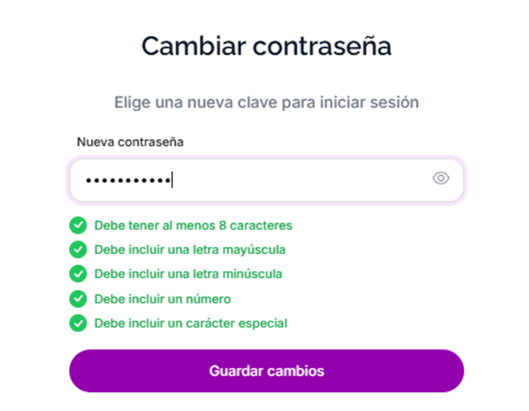 🔐 Para mayor seguridad, asegúrate de que tu nueva contraseña cumpla con los requisitos indicados (los verás en pantalla y se completarán automáticamente conforme los cumplas).