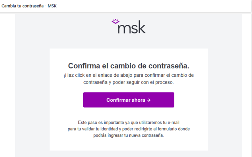 Una vez completado, recibirás un email con el asunto “Cambia tu contraseña – MSK”.